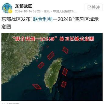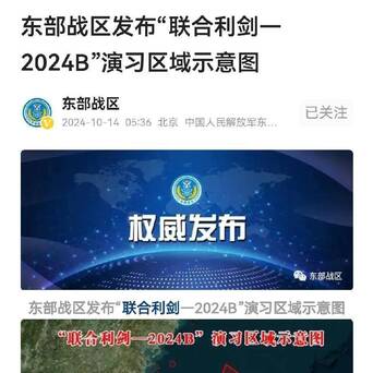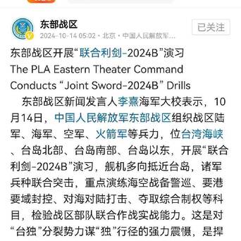10月14日早5时2分,(图7)东部战区双语发布消息,战区新闻发言人李熹表示,10月14日,东部战区组织陆海空三军和火箭军兵力在台湾海峡、台湾岛东南北四个方向,开展“联合利剑-2024B”演习,军舰军机四面包围抵近台岛,各兵种联合突击,演练了海空联合战巡、重点港口控制、对海对陆打击和夺取综合制权等科目,检验战区联合作战能力。